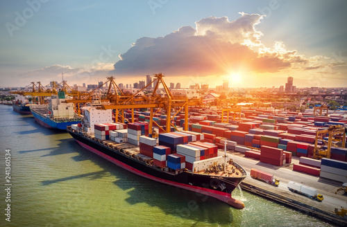 Logistics and transportation of Container Cargo ship and Cargo plane with working crane bridge in shipyard at sunrise, logistic import export and transport industry background