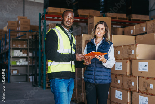 Logistics employees holding a waybill in a warehouse