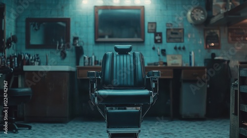 Logo of the barbershop, symbol. Stylish vintage barber chair. Hairstylist in barbershop interior. Barber shop chair. Barbershop armchair, salon, barber shop for men. Barber shop pole.