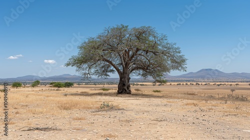 lone baobab tree stands resilient in vast, arid landscape under bright blue sky, survival and raw beauty of nature's endurance in harsh conditions