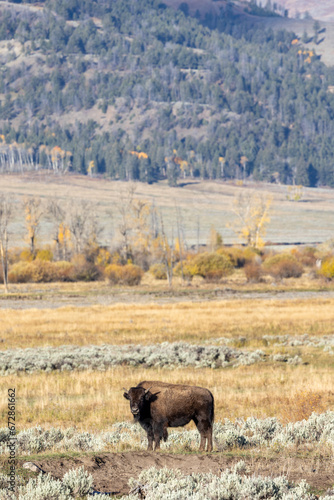 Lone bison with grand vista in Lamar Valley in Yellowstone National Park