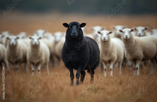 Lone black sheep stands out from herd of white sheep in field. Symbolizes uniqueness, individuality, nonconformity, independence. Herd of mammals graze in pasture, agriculture concept.