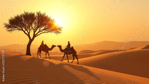 lone camel caravan traverses vast expanse golden desert dunes warm afternoon sunlight filtering wispy acacia trees