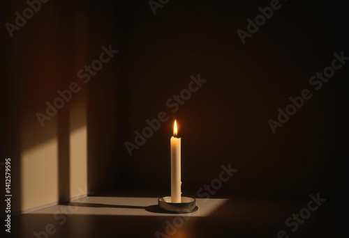 Lone candle flame dances, casting shadows on dark walls, orange, life