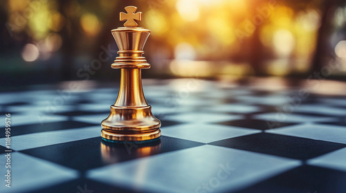 Lone chess piece standing on an empty board symbolizing strategy individuality leadership resilience modern slick white gold silver tones blurred caption space conveys mystery and contemplation