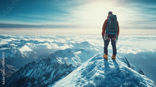 Lone climber standing on snowy mountain peak under a dramatic twilight sky