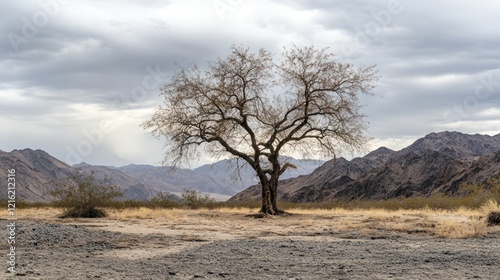 Lone desert tree, mountains backdrop, arid landscape, nature photography