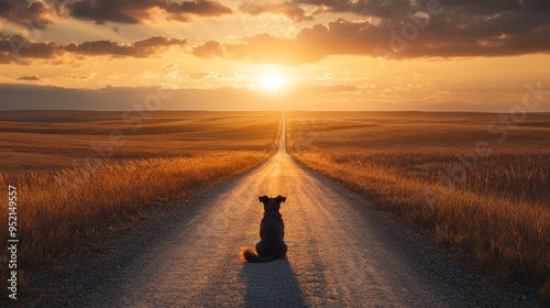 Lone Dog on Rural Road at Sunset, Evoking Isolation and Tranquility