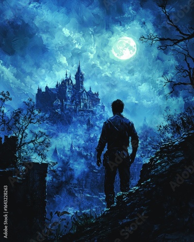 lone figure stands on rocky ledge captivated towering castle bathed in moonlight. Dark clouds swirl creating eerie atmosphere in night sky.
