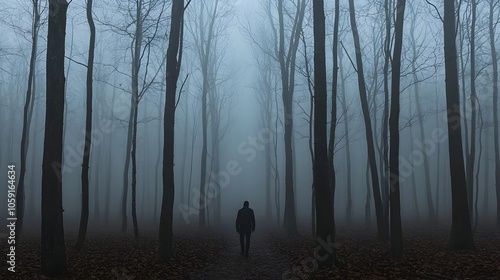 Lone Figure Wandering Through Ominous Foggy Forest Symbolizing Isolation and Slow Decline of Hunger