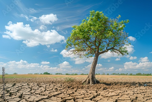 Lone green tree standing in cracked dry field. Natural disaster and drought concept. Global warming and climat change. Design for banner, poster.
