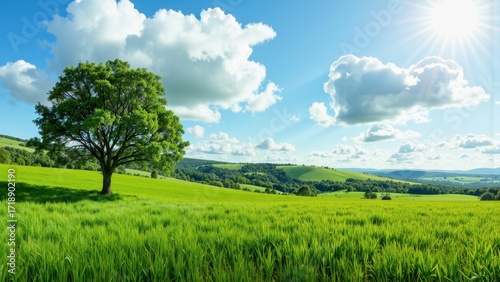 Lone green tree stands on a rolling grassy hill under a bright blue sky with fluffy clouds