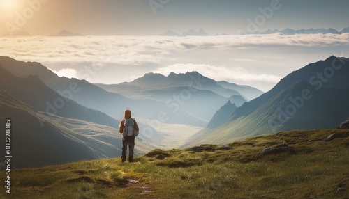 Lone hiker on mountain summit at dawn, capturing a serene outdoor adventure