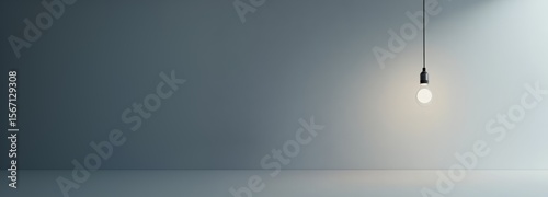 Lone light bulb suspended from ceiling, radiating soft warmth against neutral gray wall in sparse, minimalist interior space
