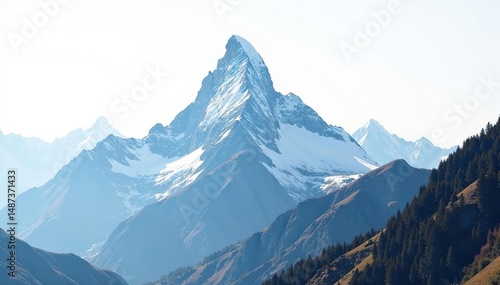 Lone majestic mountain peak against a white sky, isolated, altitude, majestic