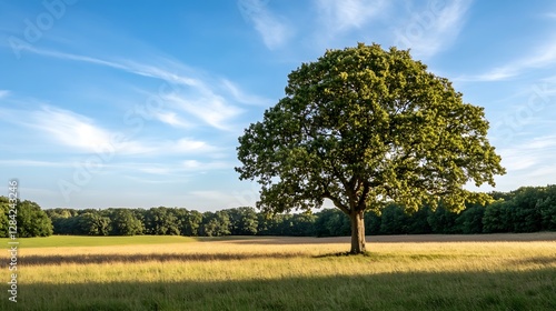 Lone majestic tree in an open field under a beautiful blue sky showcasing nature's tranquility and beauty : Generative AI
