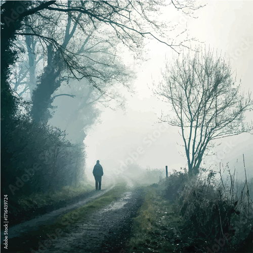 Lone Person Walking on a Foggy Path Through Countryside