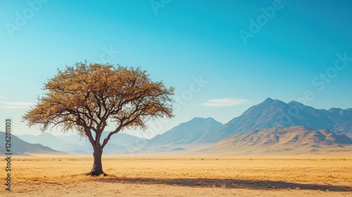Lone tree desert landscape, mountains background, nature scenery, travel photography