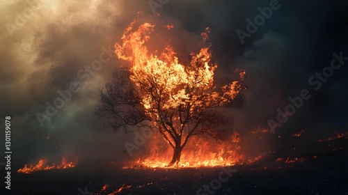 Lone Tree Engulfed In Intense Flames With Thick Smoke Rising In A Dramatic Cinematic Landscape Scene Of A Raging Wildfire Disaster