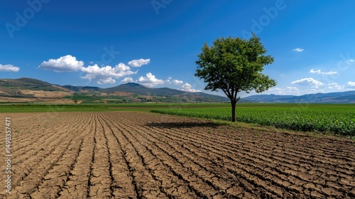 Lone Tree in a Vast Agricultural Landscape Under a Summer Sky