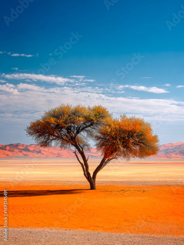 Lone tree in a vibrant desert landscape under a bright blue sky