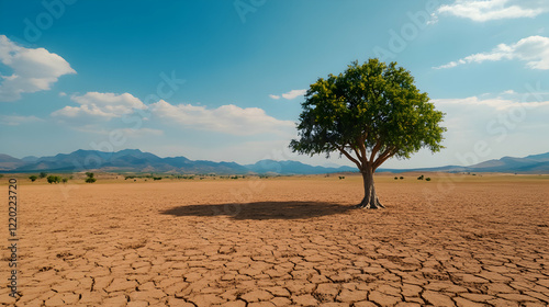 Lone tree in arid landscape, dry cracked earth, mountain background, environmental concern