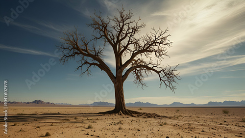 Lone tree in the desert with soft shadows and empty space. Wallpaper