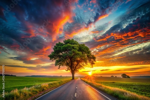 Lone Tree on Country Highway at Sunset - Scenic Rural Landscape