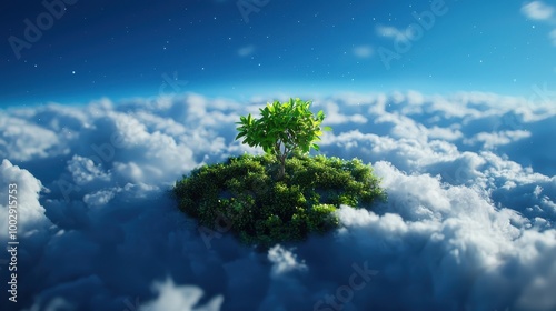 Lone tree surrounded by clouds, serene and mystical atmosphere.