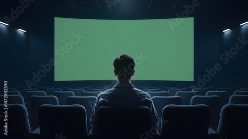 Lone Viewer Sitting In Empty Movie Theater Watching Blank Green Screen Symbolizing Cinema And Visual Creativity