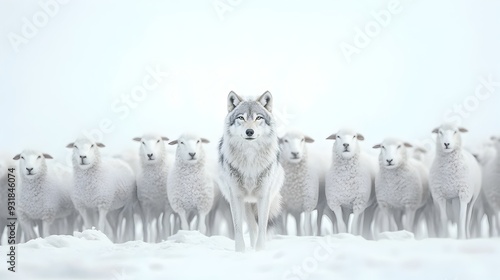 Lone Wolf Watching Over Flock of Sheep in Snowy Winter Landscape