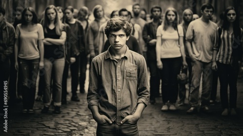 lonely guy alone among the crowd, concept of loneliness, bullying among teenagers