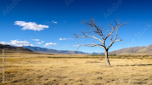 Lonely Leafless Tree in Vast Grassland Under Clear Blue Sky Creating a Serene Landscape : Generative AI