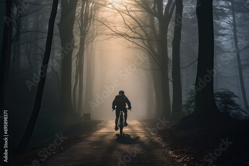 Lonely male cyclist in the morning foggy forest. A bike ride in the fresh air, alone with your thoughts.