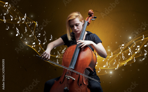 Lonely musical composer with cello and sparkling musical notes around