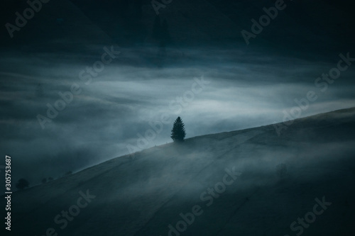 Lonely pine tree in the misty valley,at early dark morning.Autumn landscape.Vintage,retro style. Bucovina,Romania
