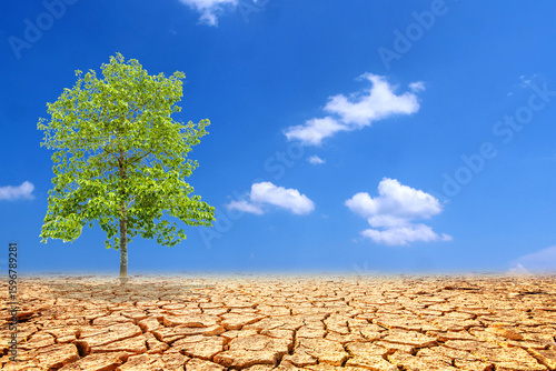 Lonely Tree: A solitary tree stands resilient against a backdrop of cracked earth and an endless azure sky, representing hope and resilience.