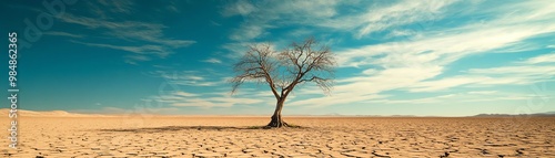 Lonely tree in a vast, barren desert landscape under a clear blue sky. Pristine nature and solitude captured in a striking panoramic view.