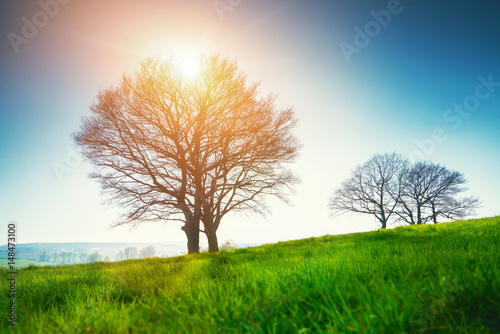 Lonely tree on a field of grass in spring with beautiful bright sun rays