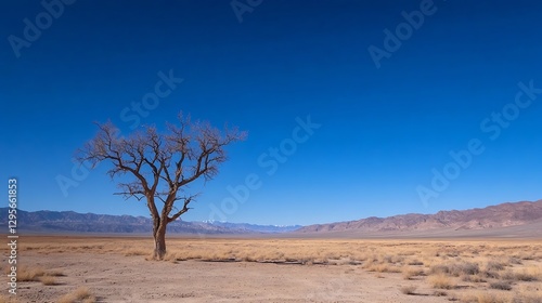 Lonely tree standing resilient in a vast dry desert landscape under a bright blue sky : Generative AI