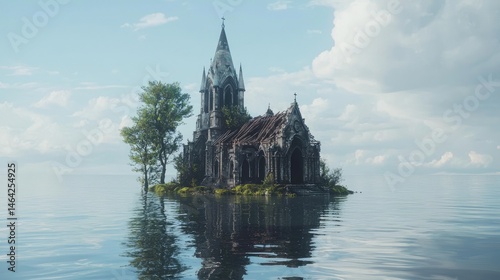 Lonely, weathered church on a watery island.