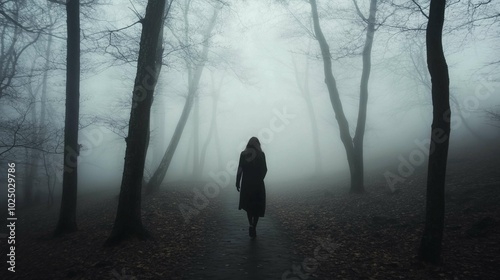 Lonely woman walks on footpath in dark foggy mystery forest. Spooky atmospheric mood in autumn woodland