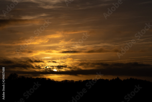 Lonesome bird over beautiful setting sun reflecting on hazy clouds