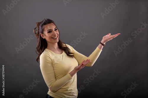 Long dark hair woman pointing with hand and smile in studio with grey background
