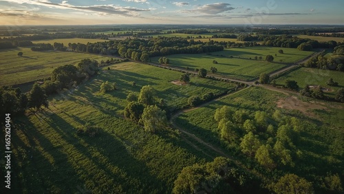 Long exposure aerial perspective of picturesque farming areas and greenery