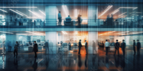 Long exposure banner of busy crowded office hallway with business people. Generative AI