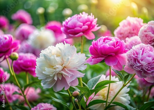 Long Exposure Blooming Peonies in Garden - Vibrant Pink and White Flowers