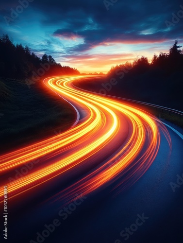 Long Exposure Night Road: Vibrant light trails winding through lush scenery at sunset, ideal for travel or transportation themes.