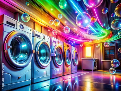 Long Exposure of Modern Washing Machines in a Bright Laundry Room with Soapy Bubbles and Soft Lighting