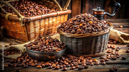 Long Exposure of Raw and Roasted Three Color Coffee Beans in a Rustic Basket, Capturing the Essence of Coffee Culture and Artisan Craftsmanship